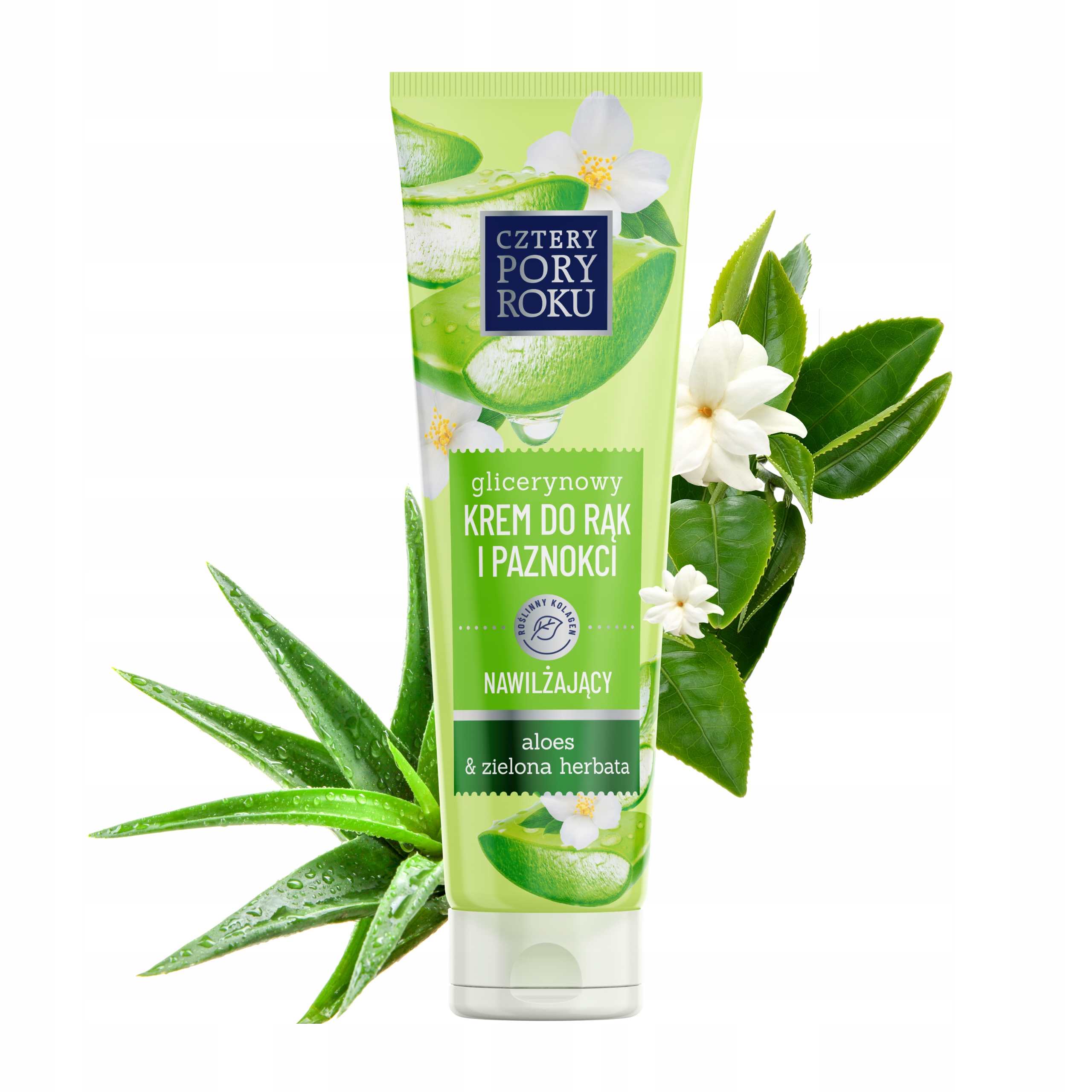 Sucha i wrażliwa skóra dłoni wymaga intensywnego nawilżenia i ochrony, dlatego glicerynowy krem do rąk Cztery Pory Roku został wzbogacony o aloes i ekstrakt z zielonej herbaty, które silnie nawilżają, łagodzą podrażnienia oraz pielęgnują płytkę paznokcia. Małe, poręczne opakowanie zmieści się do damskiej torebki, a także idealnie sprawdzi się w podróży.