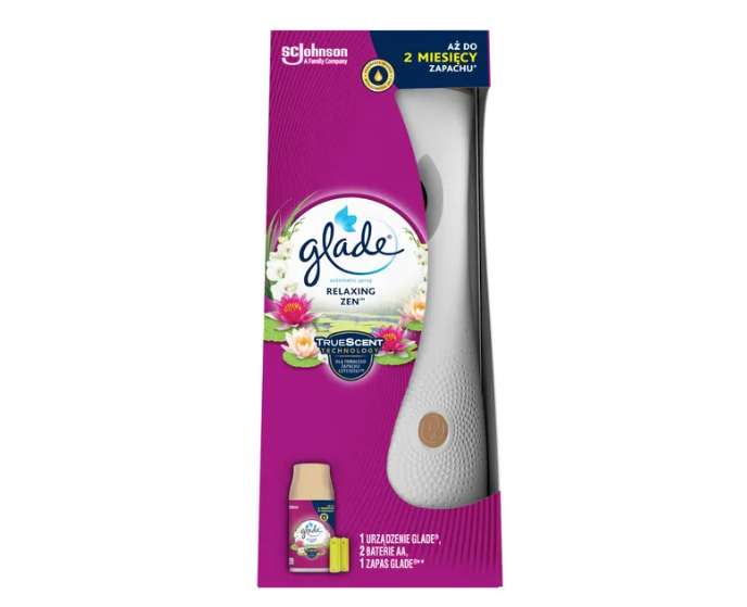 Elegancki dozownik elektryczny marki Glade by brise, który jest kompatybilny z wkładami odświeżaczy powietrza Glade. Oprócz dozownika, w opakowaniu znajdziemy także wspomniany zapas w puszcze o pojemności 250 ml, a także dwie baterie AA – czyli elementy niezbędne do uruchomienia odświeżacza.